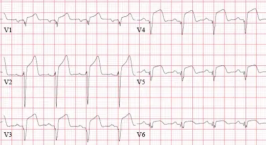 En 62-årig kvinde oplever stigende trykkende smerter i øvre del af maven i de seneste 5 timer. Et EKG udføres i triagen. Hvad er den mest sandsynlige tolkning?